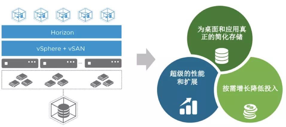 VMware vSAN解决了存储成本和复杂性的问题,以最佳性价比和最优可管理性为用户提供高性能、闪存加速的数据存储方案,是VDI部署中最好的存储支撑方案。vSAN与VDI方案的最佳契合点体现为: