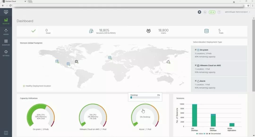 Horizon Cloud on Microsoft Azure:适用于 Azure 的用户,Horizon 的管理平台由 VMware 提供,用户的工作负载(虚拟桌面和托管应用)运行在 Azure 平台上;这一类用户的企业应用和数据也都在 Azure 中,虚拟桌面和托管应用运行在 Azure 平台上访问更加快速便利。