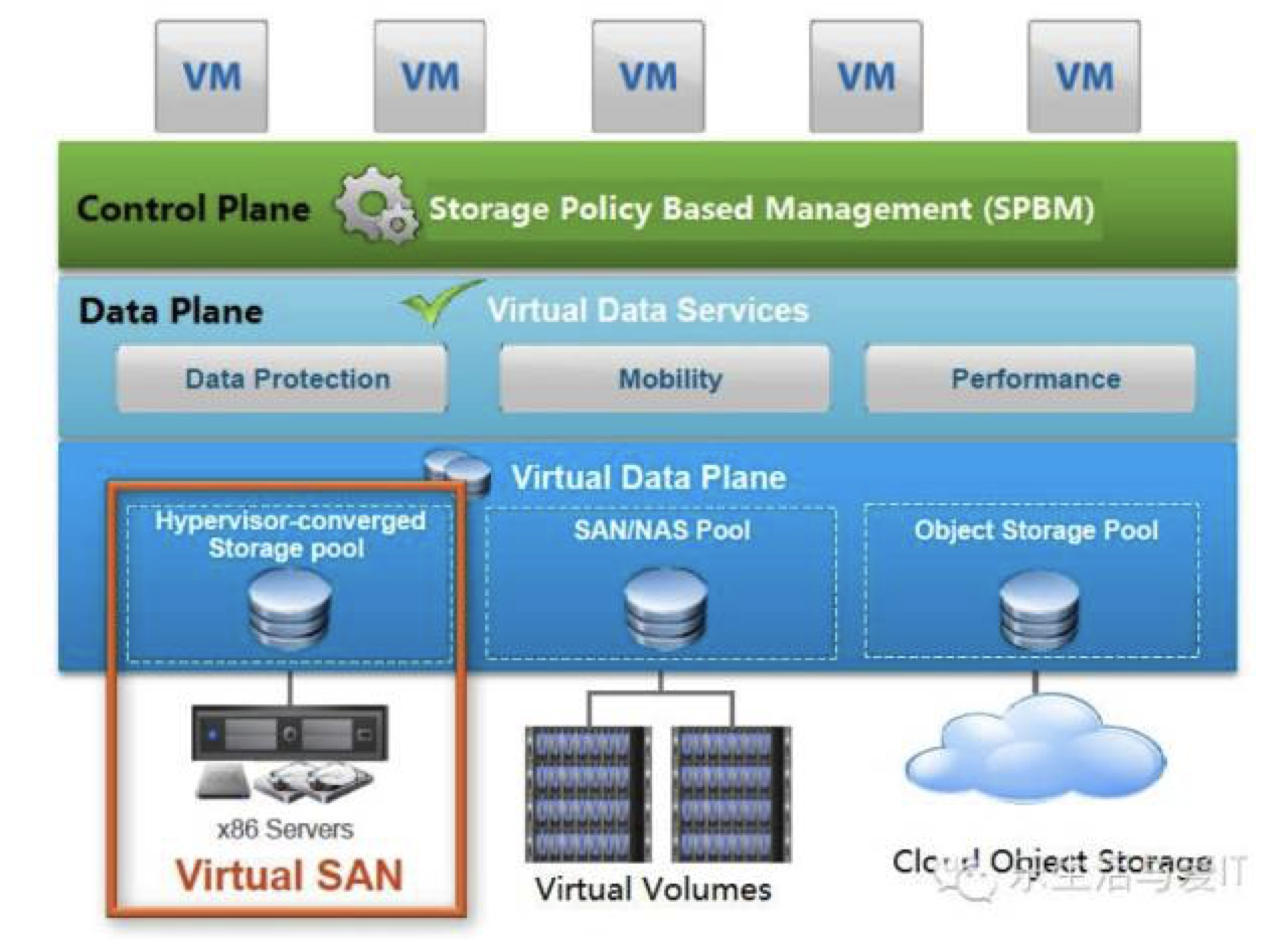 VSAN是VMware SDS Data Plane的一部分,另外两个是Virtual Volumes和Cloud Object Storage,如下图所示。