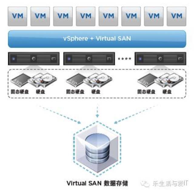 VSAN把vSphere集群服务器各个节点内的SSD(固态硬盘)和HDD(硬盘),聚合在一起,构成一个共享的存储池。
